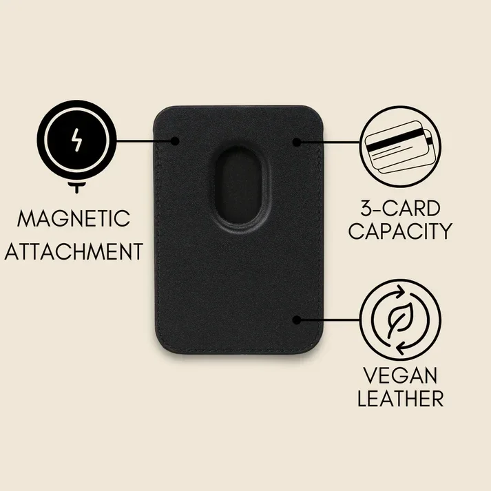 Gefertigt aus biologisch abbaubarem, veganem Leder und ausgestattet mit einem integrierten Magneten, lässt es sich mühelos an einer MagSafe-Handyhülle befestigen oder als eigenständiger Kartenhalter für Kreditkarten und Ausweise nutzen.