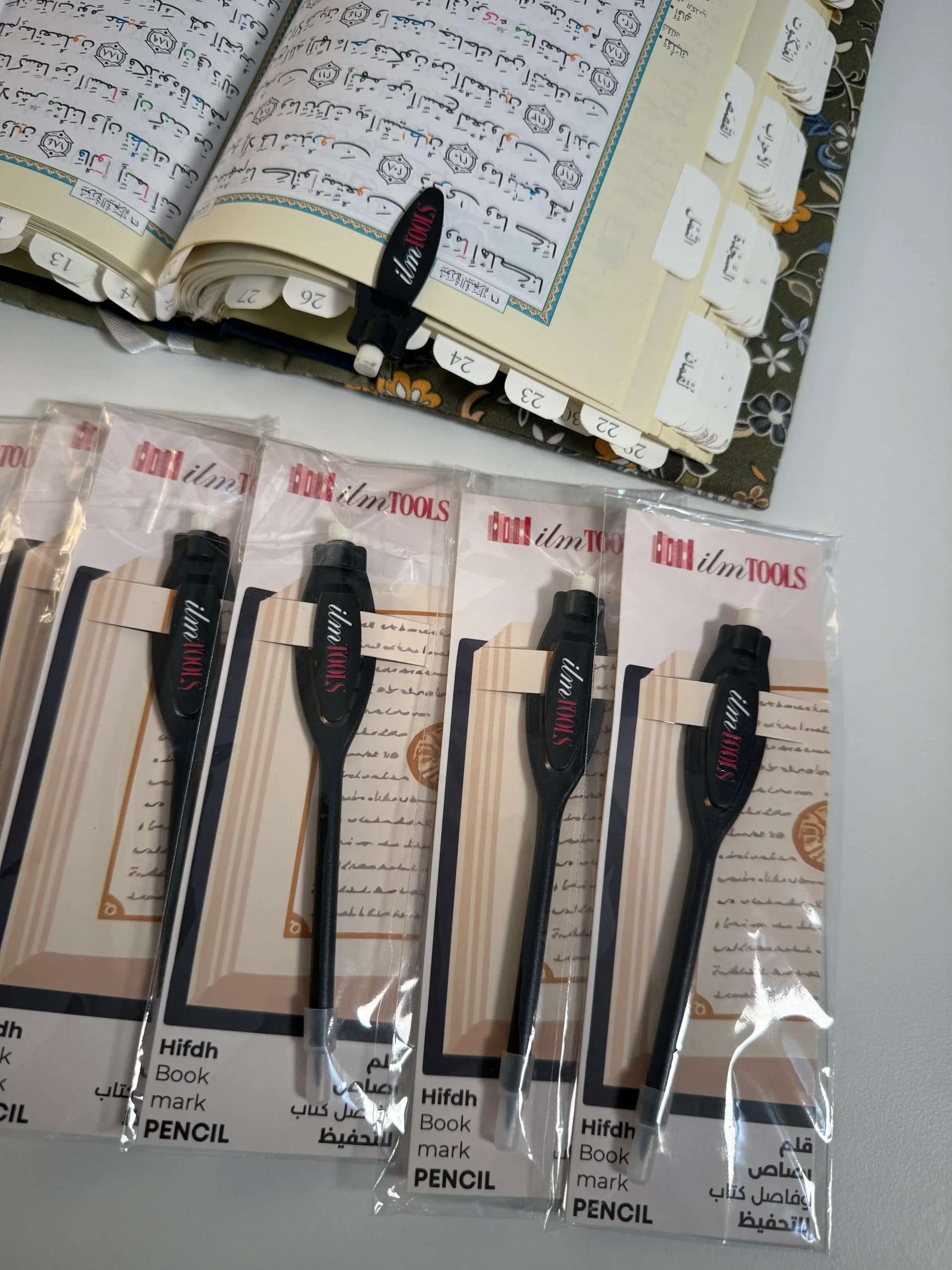 Unsere Hifz-Bleistift-Lesezeichen sind eine einzigartige Innovation für Qurʾān-Schülerinnen und -Schüler. Schluss mit dicken, unhandlichen Bleistiften zum Korrigieren von Fehlern.